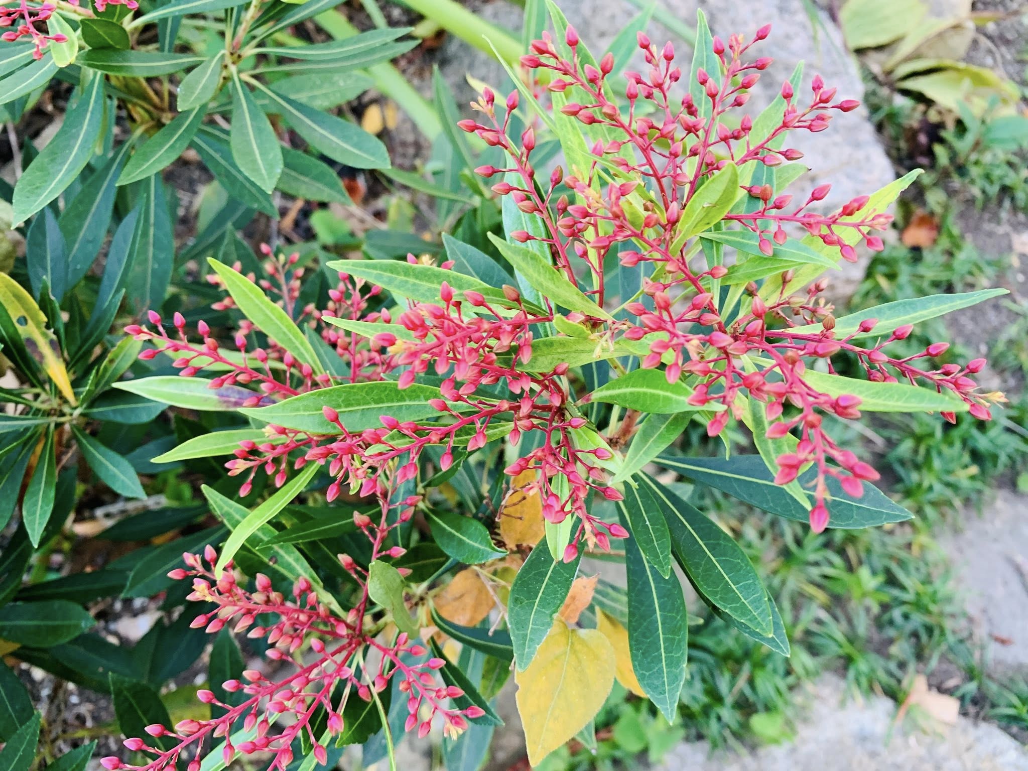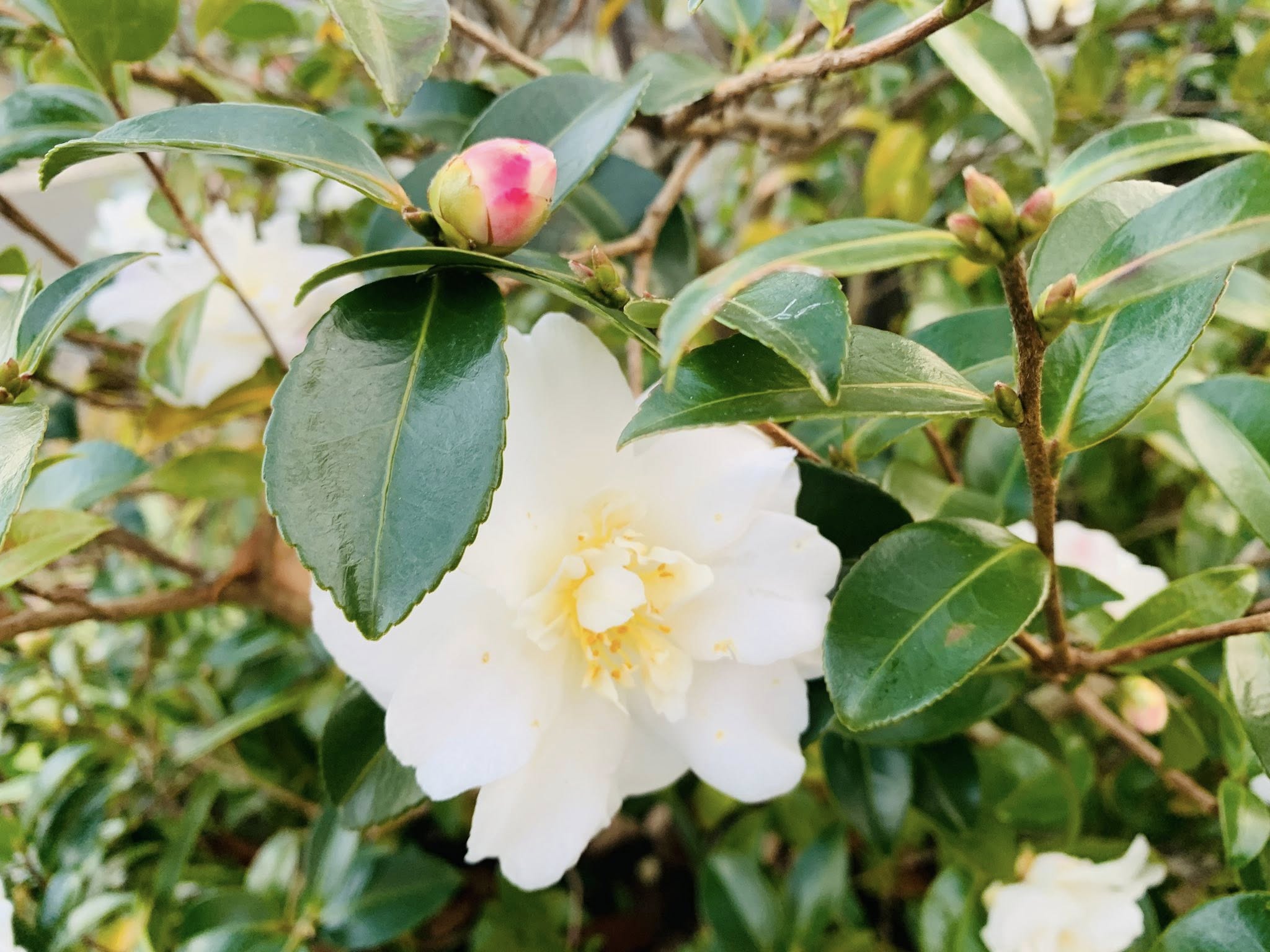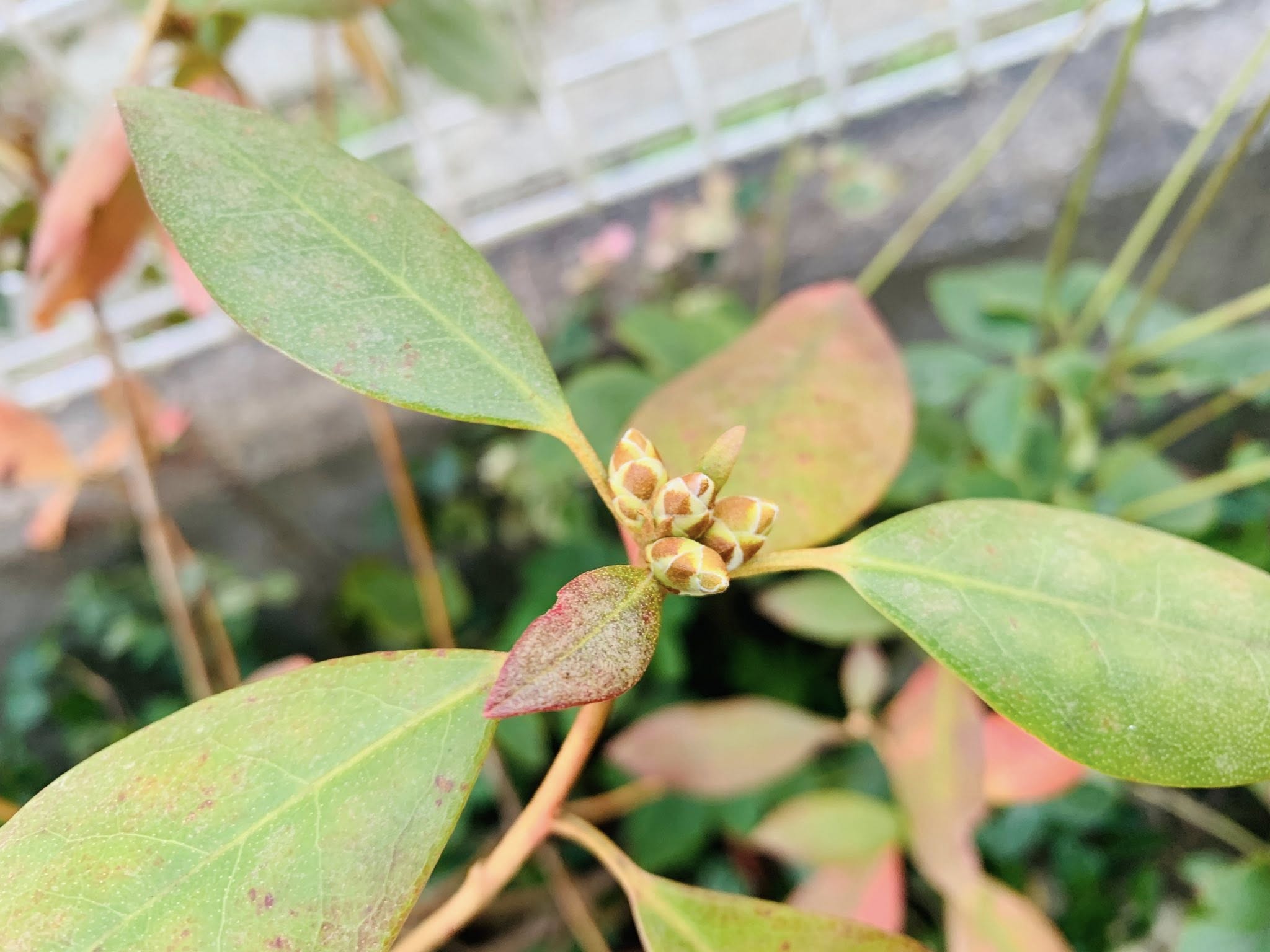 ▪️そのような作業ですが、庭が少しずつ変化していることに気がつきます。入り口の横に植えてある(ガスメーターを隠している?!)ドウダンツツジが、素敵な色に紅葉しました。実に鮮やかです。春には、小さな白い花を咲かせてくれますが、この季節はこのような紅葉になります。白い花はカンツバキです。カンツバキ(寒椿)は、ツバキとサザンカの交雑種のようです。たくさん咲いてくれています。蕾の時には、少し赤っぽい色も見えていますが、咲くと真っ白な美しい花を咲かせます。ただ、枯れるとちょっと見てくれが悪いんですよね。茶色のくちゃくちゃになります。ですから、そうなると摘み取っていかねばなりません。小さなピンク色のものは、リュウキュウアゼビの花芽です。寒い冬を超えて、春になると花を咲かせてくれます。円錐花序を下の垂らして、小さな筒状つぼ状の白い花がたくさん咲きます。開花の時期を想像しながら、よく咲けるように周りの状況を整備しています。