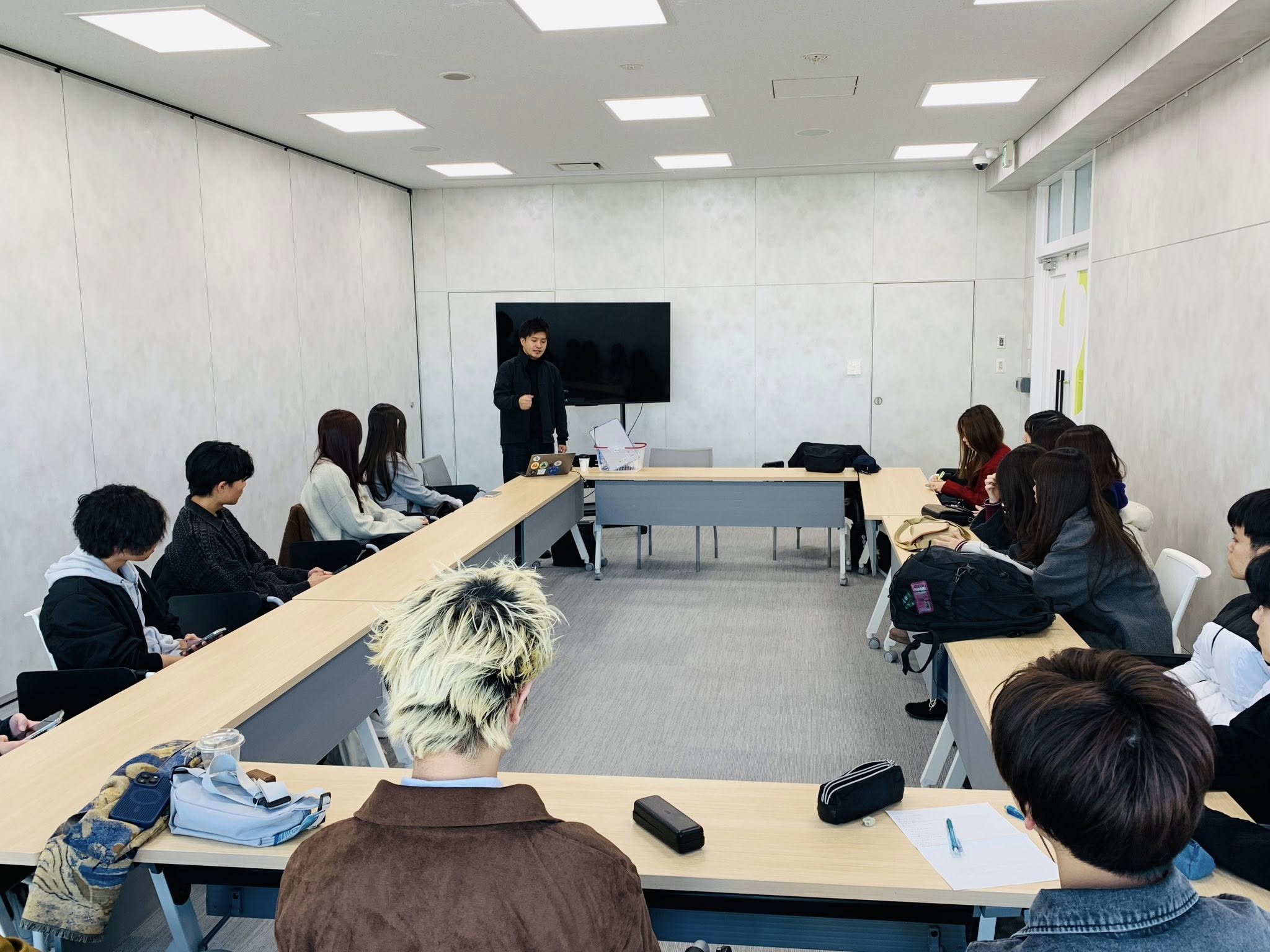 ▪️先週の土曜日のことになりますが、新カリキュラム「基礎ゼミナールB」の学生さんたちと一緒に、京都市の御池通り沿いに店舗をかまえ、靴磨きと修理の「革靴をはいた猫」を経営されている魚見航大さんからお話を伺いました。基礎ぜみなーるの実習です。場所は、「革靴をはいた猫」にしは全員がお邪魔するにはスペースがないということで、京都信用金庫の「QUESTION」というコワーキングスペース・レンタルスペースのある建物の会議室です。京都市役所の斜め向かいにあります。