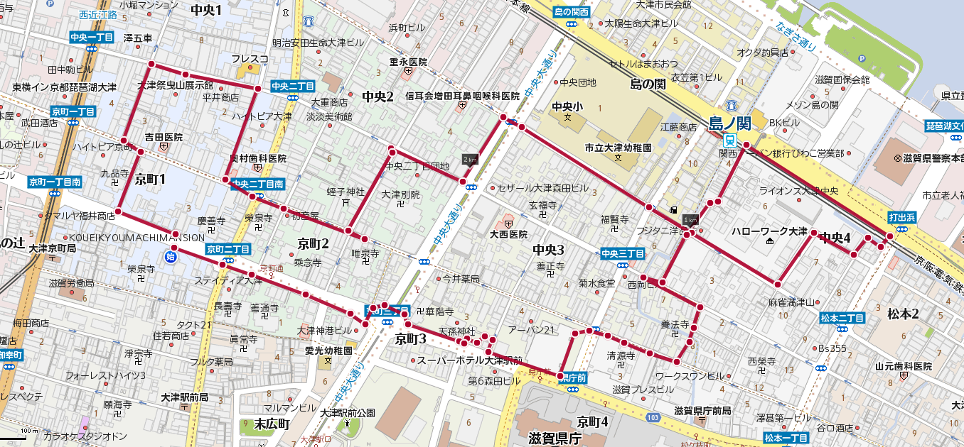 ■今回のまち歩きでは、「stork」という手作り家具のお店に立ち寄りました。ここには書けませんが、こちらの店主さんといいますか、家具職人の方とは、偶然にもつながりがあったのです。とても驚きました。良いご縁ができました。途中、丸屋町商店街にある平井商店にも立寄り、夏向けの純米大吟醸を1本購入(職員のNさんも同じものを…)、奥様といろいろお話しをさせていただきました。そして、大津祭曳山展示館、大津百町館でも、お話しをさせていただきました。個人的にも、おしゃべり付きの楽しいまち歩きになりました。この日のまち歩きのコース、地図に落としてみました。距離にすれば3km程の距離ですが、いろいろ解説して歩いたので、2時間半程の時間がかかっています。汗びっしょり…でした。