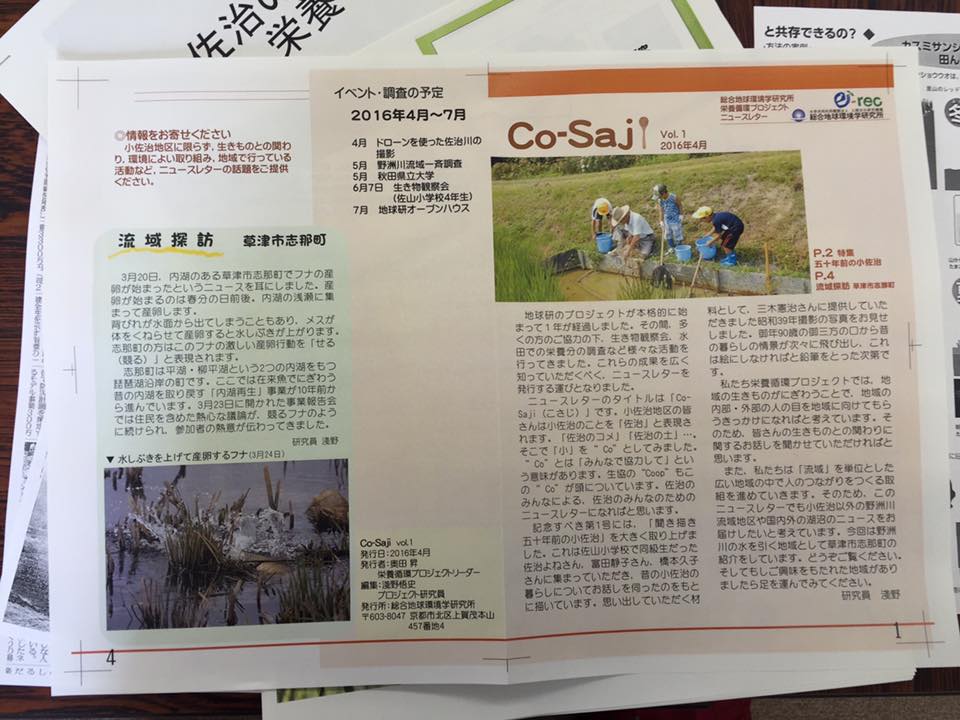 ■29日(火)は、総合地球環境学研究所のプロジェクト「生物多様性が駆動する栄養循環と流域圏社会―生態システムの健全性」のメンバーと一緒に、滋賀県甲賀市甲賀町小佐治に行きました。小佐治で取り組んでいる調査の成果を、小佐治の農家の皆さんに報告するためです。プロジェクトの3名の研究員の皆さんが報告を行いました(私は、司会進行で場を盛り上げる係でした)。淺野悟史くんが「小佐治のひとといきものの関わり」について、上原佳敏くんが「小佐治 生物調査結果」について、石田卓也くんが「小佐治の水田土壌の栄養状態」について報告を行いました。