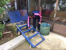 ■山田さんとfacebookでお友達の皆さんはよくご存知だと思いますが、山田さんは、真野浜に漂着した水草を丁寧に手作業で集めて乾燥しておられます。水分を含んだ水草をそのままにしておくと、腐敗が始まり、異臭を放つようになるからです。この真野浜で民宿を経営されているから、ということもあるのでしょうが、それよりもこの浜を綺麗にしたい、素敵な浜にしたいという個人的な思いから、流れ着いた水草を集めて乾燥されているのです。最初は手作業でされていたようですが、水分を含んだ水草はとても重く重労働になります。そこで、「身近な材料や道具」を使って、「フォーク2号」という道具を発明されました。これは、一輪の手押し車を二輪に改良して、その先に、農作業用のフォークを取り付けたものです。足の力を使って重たい水草を簡単に持ち上げることができます。テコの原理ですね。最初は、もっと重量級の「フォーク1号」だったらしいのですが、もっと軽くて使いやすいものをということで、さらに工夫されて現在の「2号」に落ち着いたようです。山田さんは、これ以外にも、いろいろ工夫をされています。乾燥した水草や湖岸の樹々の落ち葉を集めてビニール袋に入れる際には、最初にプラスチック板をビニール袋の中に入れて、筒のようにすれば、簡単に水草や落ち葉を入れることができるそうです。すごいな。「フォーク2号」と同様に、これも「身近な材料や道具」でできます。