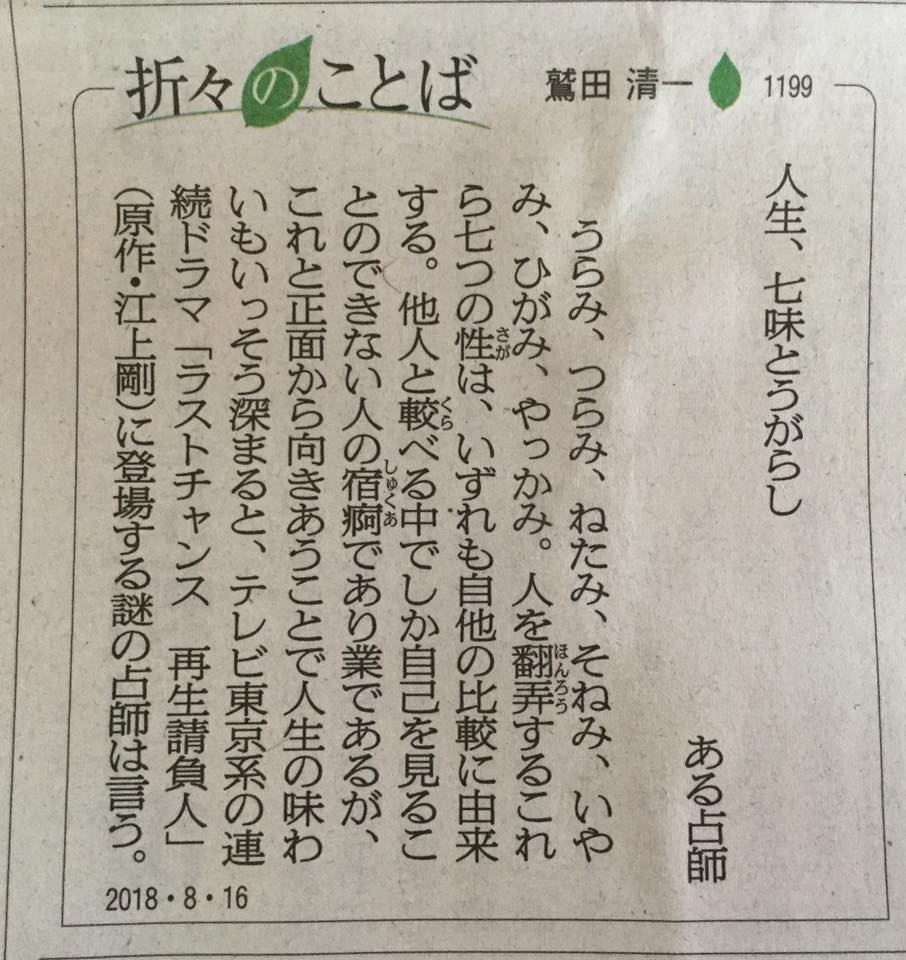 ◾️朝日新聞の1面に、哲学者の鷲田清一さんが「折々のことば」を連載されています。それぞれの新聞の記事にはある種の政治的「傾向」が見られ、そのような「傾向」に対する好き嫌いはあると思いますが、そのことは別にして、この鷲田さんのコラムを楽しみにされている方もおられるのではないかと思います。8月16日のコラムのタイトルは、「人生、七味とうがらし」です。どなたの「ことぱ」なのかといえば、「ある占師」です。「ある占師」が言った言葉ということです。鷲田さんは、どこの「ある占師」にそのような言葉を聞いてこられたのかとよく読んでみると、テレビドラマ「ラストチャンス 再生請負人」の中に登場する謎の占師の言葉なのだそうです。私の知らないドラマです。ネットで調べて見ると、テレビ東京のドラマのようですね。番組の公式サイトによれば、この占師をミッキー・カーチスさんが演じておられるようです。