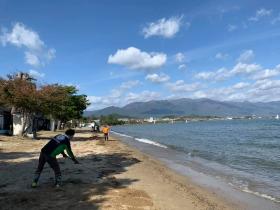 ■今日は、15人ほどの方達が集まりました。テストですので、基本、「水宝山」の仲間のつながりで集まった方達です。私のゼミの学生Yくんも参加してくれましたし、「水宝山」の活動を応援してくださっている市役所や県庁の職員の方達も参加してくださいました。以前、「水宝山」の仲間の山田さんと2人で水草の撤去や掃除の作業をした時は、かなり時間が必要でした(山田さんは、「水宝山」の代表であり、浜の掃除を始められた方です)。しかし、今日のように多くの方達と一緒に作業をすると、予想以上に早いスピードで浜が綺麗になっていきました。考えてみれば当たり前のことのなのですが、そのことに改めて驚きました。また、とても嬉しくもありました。