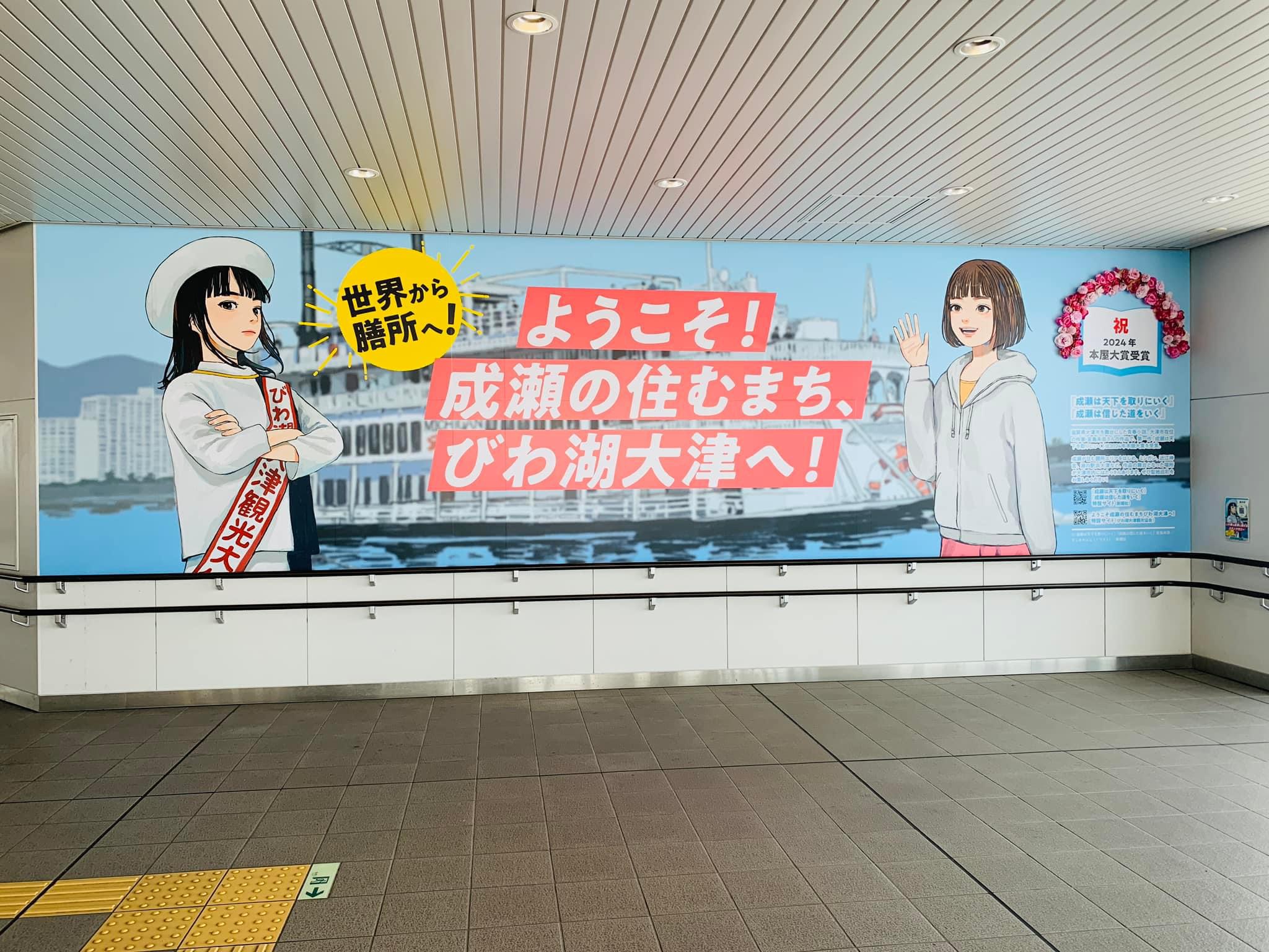 ▪️その後、無事にこの本は出版され、知らない間に大変な話題になりました。そして、とうとう昨年度の本屋大賞を受賞されました。そして続いて、第2作『成瀬は信じた道をいく』も出版されています。他の地域ではどうなのかよくわかりませんが、滋賀県、特に大津市ではめちゃくちゃ盛り上がっているように思います。大津市は、NHKの「光る君へ」と「成瀬」で話題になっているのです。左の写真は、JR膳所駅です。もう完全に話題に便乗して観光宣伝をされています。我が家もAmazonで取り寄せました。カバーのイラストと小説の中身とが、うまくマッチしているようにも思います。