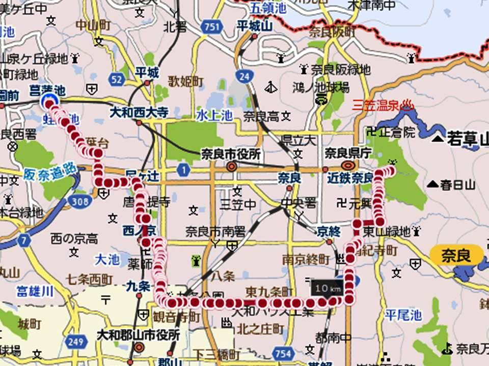 ■自宅の最寄り駅からスタート。最近は、いつも駅を起点にしています。自宅は奈良西部の丘陵地帯にあるので、南にいくとどんどん下っていきます。下ったあとも、ひたすら南下。有名な唐招提寺や薬師寺の横を走ります。このあたり、とっても気持ちの良い風景なのです。いつもはここで引き返すのですが、今日は、さらに佐保川沿いを大和郡山市の方面に走りました。大和郡山市に入ってすぐ、九条公園で東に進路を変えます。そのままひたすらまっすぐ東へ走りました。このあたりは、もともと農村地域です。古い集落と、新しい住宅地がまだらになった風景をながめながらひたすら東に走ります。
