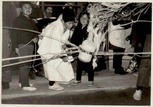 ■私は、子どものときに、この「亥の子」を経験しています。小学校6年生(1970年)のとき、私は広島市の東部にある農村地域(混住化していましたが)に暮らしていました。そのときに「亥の子」を経験したのです。写真の少年は、私です。私は神主・禰宜のような格好をしています。地域にあるお宅を1軒1軒まわり、まず家の入り口でお祓いをします。そのあと、後についてきた子どもたちと、「亥の子石」についた縄をもって、地面を搗きます。そのとき、「い~のこ、いのこ、い~のこ餅ついて~、繁盛せ~、繁盛せ~」と歌うのです。このあたりは、地域によっていろんなはパターンがあるようです。