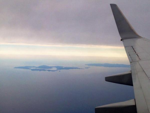 ■さて、ふだんあまり映画を視ないので、けっこう「スパイダーマン」を楽しんでいたのです。ふと、外に目を向けると、島が見えました。時間的にいって、この大きさと地形的な様子からして、きっと島根県の隠岐諸島に違いないと思いました。自宅に帰ったあとGooglMapと写真を照らし合わせてみましたが、やはり隠岐諸島でした。