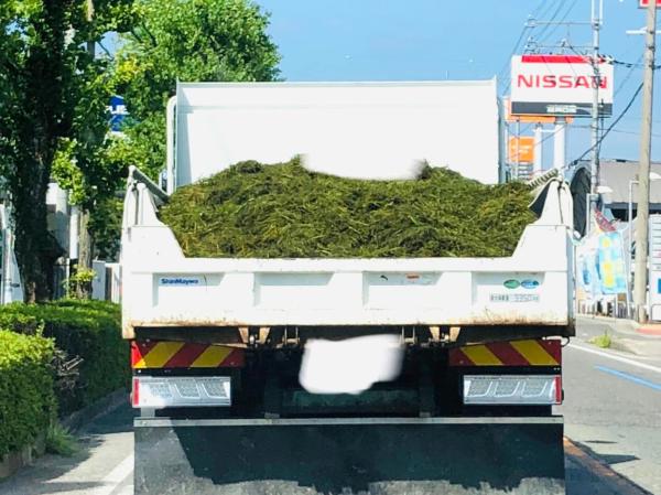■それはともかく、一昨日のことです。近所を車で運転しているとこんなトラックが走っていました。助手席の妻にとってもらいました。刈り取った水草らしきものを大量に積んでおられたからです。初めて拝見しました。こんな感じなんだ〜とちょっと興奮しました。こんな様子を見て興奮するのは、私ぐらいでしょうかね(^^;;。この水草、確か近江八幡市だったと思いますが、休耕田に野積みにして自然発酵させて、数年後に水草堆肥として無料配布されていたと思います。