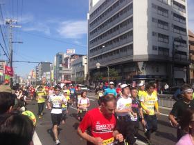 ■昨日は、第4回「大阪マラソン」でした。私は、第3回の大会で出走しました。そのときに、私のランを私の家族と一緒に応援してくださった同僚の原田先生が、今回は出走されました(私は抽選に落ちました…)。ということで、昨年の恩返し、原田先生のお友達の皆さん一緒に応援をさせていただくことにしました。昨日は快晴でした。マラソンにはうってつけの…と書きたいところなのですが、ぐんぐん気温があがり、マラソン向きのコンディションではなくなってしまいました。原田先生は、そのようなコンディションにもかかわらず、目標の時間を達成して完走されました。おめでとうございます。