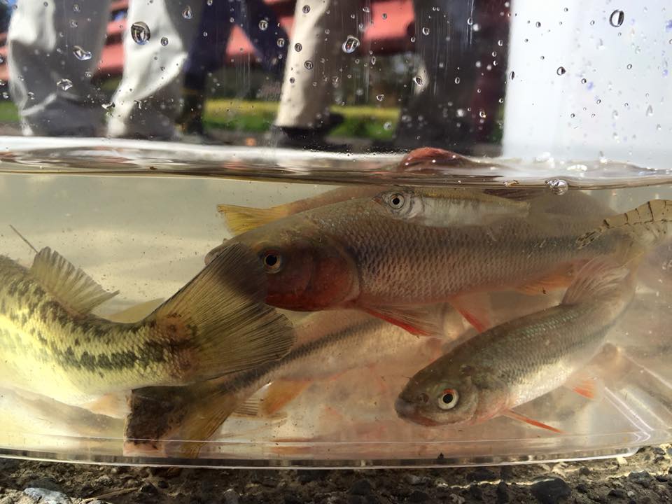 ▪︎とはいえ、ヌマムツ、タイリクバラタナゴ、カマツカ、オオクチバス等の魚が確認できました。オオクチバスは、こんなところまでいるんですね。困ったものです。ヌマムツという魚は、私が以前、琵琶湖博物館で働いていた頃は、「カワムツA型」と呼ばれていました。カワムツの仲間に分類されていたのです。しかし、適応している水環境や形態の違いから2003年には新和名「ヌマムツ」がつけられました。写真に大きく確認できているのは、ヌマムツですね。これ以外にも、エビやイシガメ。それから、オオクチバスと同じく外来生物であるアメリカザリガニやウシガエルのおたまじゃくしも確認できました。