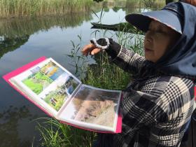 ■「針江 生水の郷委員会」の皆さんに、針江集落内の「カバタ」をガイドしていただいたあと、学生たちと私は、タクシーに分乗して琵琶湖の湖岸のあたりにある内湖「中島」に向かいました。地図をみればわかりますが、集落内の川を流れた水は琵琶湖に向かいます。そして、琵琶湖に流入するまえに、いったん内湖「中島」に注ぎ込みます。私たちは、この「中島」について、委員会のガイドであるFさんからお話しを伺いました。