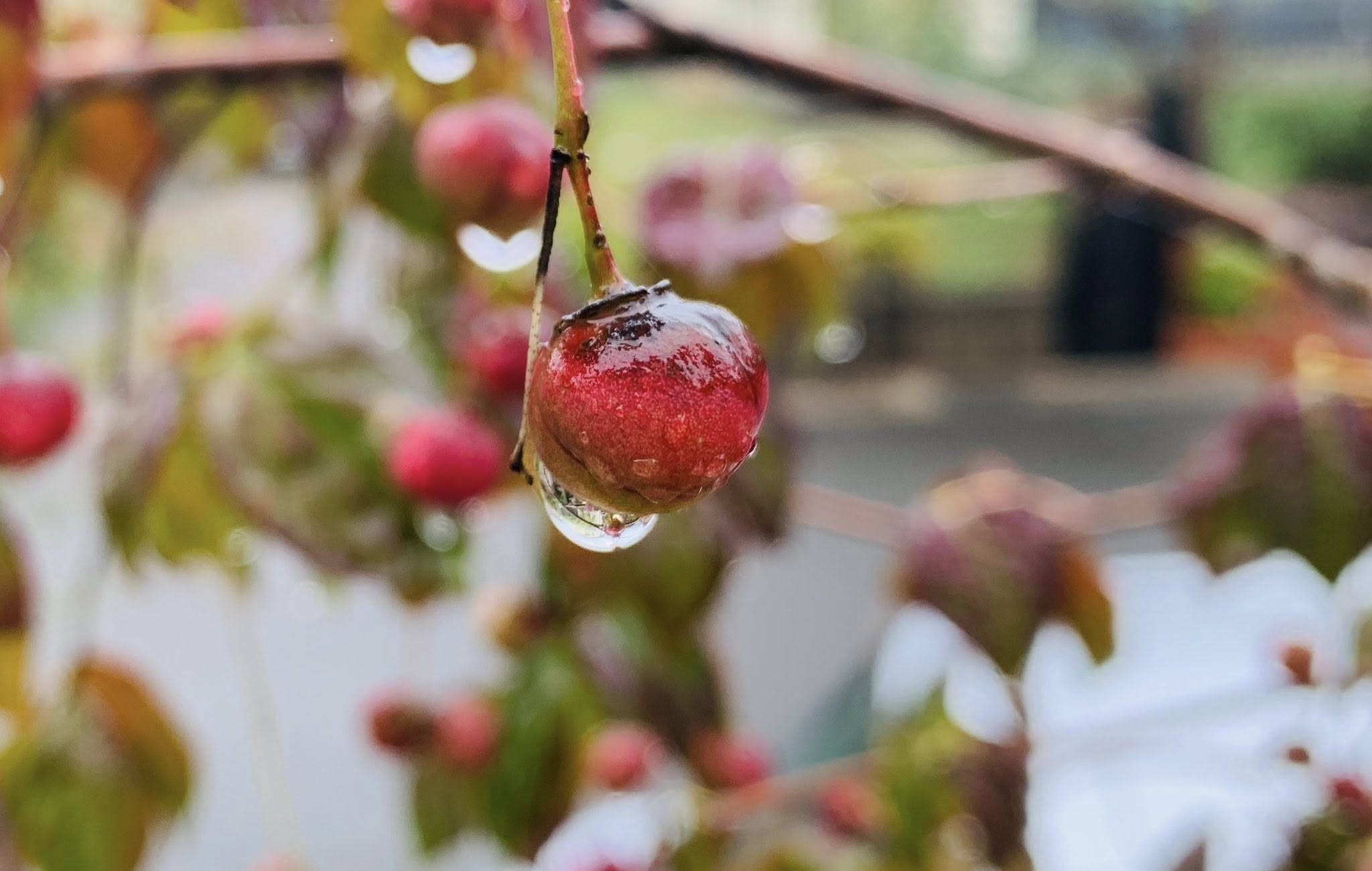 ▪️その横には、ツリバナが植えてあります。もともとは、オセアニア地域の樹木であるブラシノキが植えてありましたが、庭師さんのご提案もあり、在来種の里山の低木であるツリバナに植え替えていただきました。このツリバナ、なかなか可愛らしいのです。春は、ちょっとピンクっぽい色が混じった、淡い色の小さな小さな花を咲かせますし、秋になると写真のような赤い実がなります。実が熟すと、クス玉みたい5つに割れます(クス玉は2つですが)。中から真っ赤な種が現れます。でも雨が降ったせいで、実の下に雨の滴ができていました。それがレンズのようになり、向かいのお家が反対になって見えました。こういうので、ちょっと嬉しくなるのですから、なんとも単純な人間です。ツリバナの実、晴れた月曜日(昨日)、とうとう割れ始めました。
