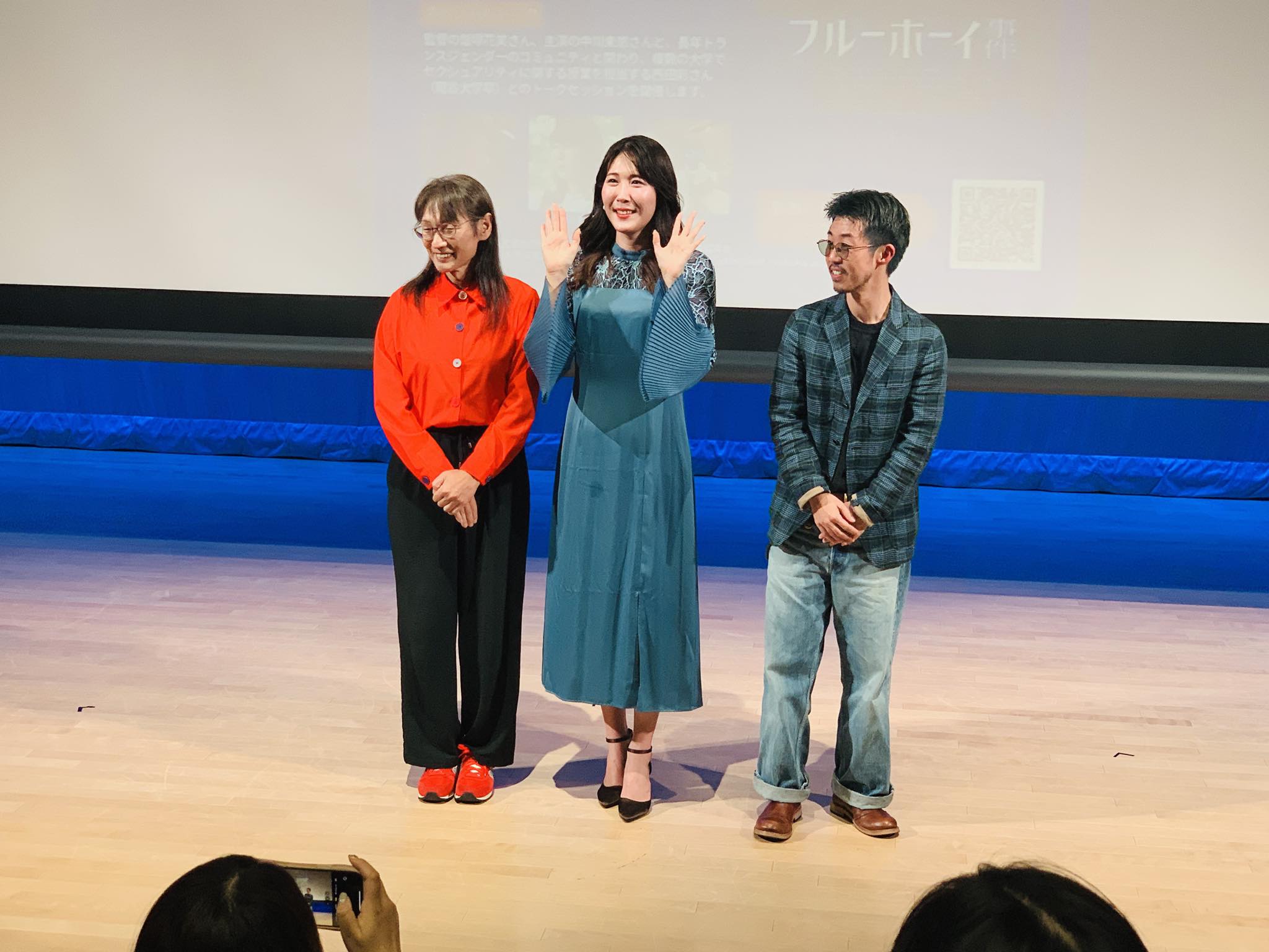 ▪️昨日は、15時半から深草キャンパス成就館の4階メインシアターで、映画『ブルーボーイ事件』の龍谷大学での特別試写会とトークセッションが開催されました。映画のあとのトークセッションでは、主演の中川未悠さん、監督の飯塚花笑さん、コーディネーターとして龍大卒業生の西田彩さんが登場されました。この映画の概要は以下の通りです。