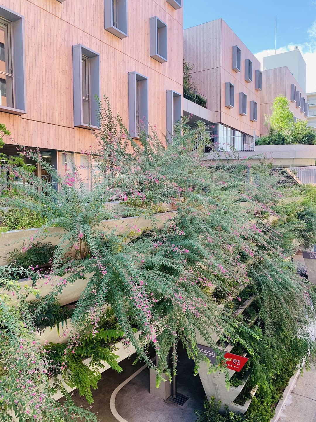 ▪️このような建物なのですが、1階と2階のあいだの壁面は、土が入れられており、そこにさまざまな植物が植栽されています。ここが、設計上のひとつの「うり」のようですね。今目立っているのは、ハギ(萩)です。落葉低木。秋の七草のひとつです。我が家の庭にもハギが植えてあるのですが、花のシーズンがおわり落葉する前に、株元から切り戻します。お世話になっている庭師さんに、「ハギはそうやって毎年剪定する」ということを教わりました。そうしないと、大きくなりすぎてしまいます。古い枝には花芽がつかないので、剪定しないでいると花つきが悪くなるかも…ということのようです。この建物のハギの剪定はどうするんでしょうね。気にしています。