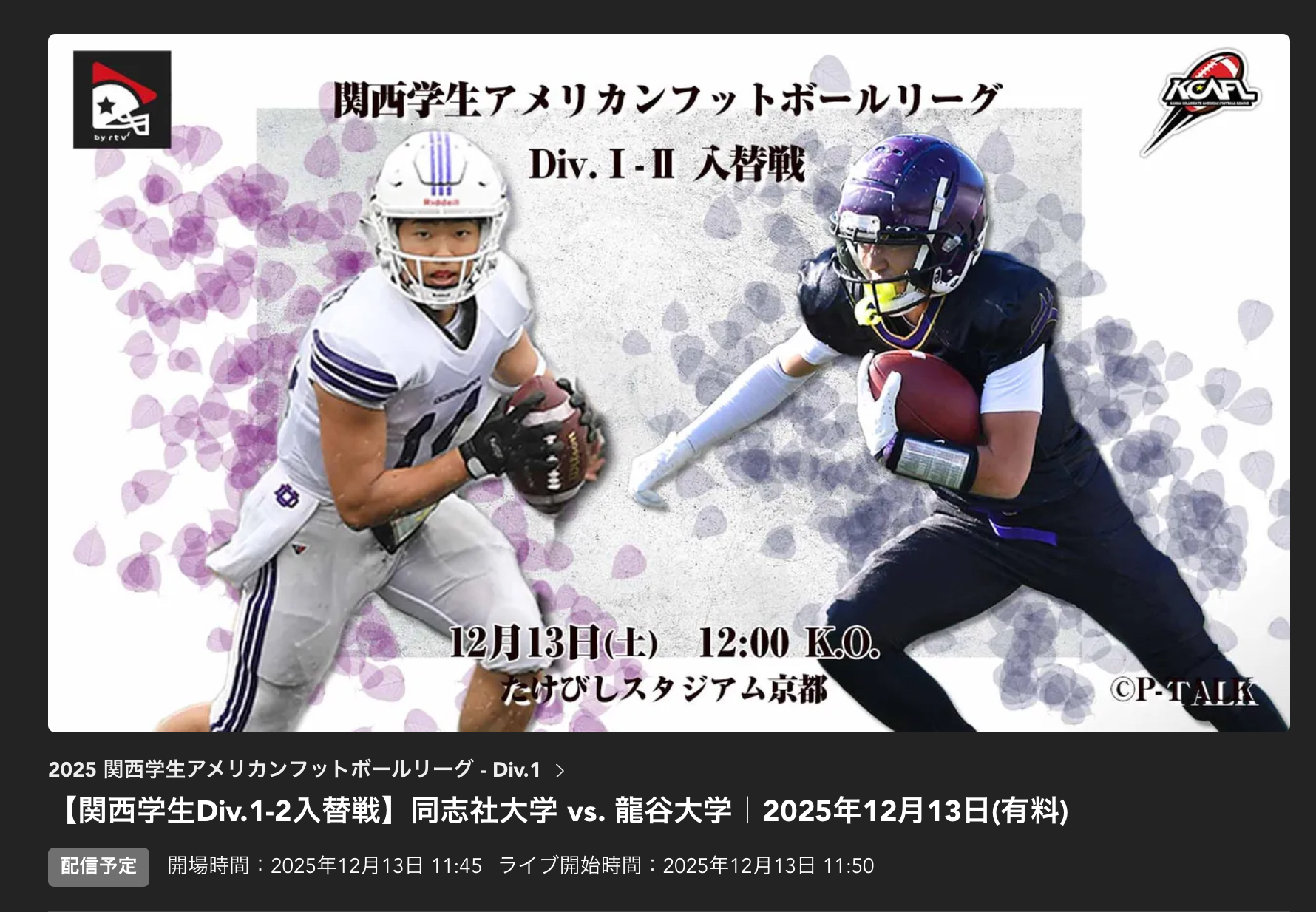 ▪️甲子園ボウルの前日になりますが、甲子園ボウルの前日、Div.1と2の入れ替え戦があります。Div.2で2位になった龍谷大学シーホースは、Div.7位の同志社大学ワイルドローバーと対戦します。龍大関係者、ぜひ応援してください。なんとしても、Div.1に復帰してもらいたいです。ところで、龍谷大学のシーホースってタツノオトシゴの意味です。「龍」谷大学ですから。一方、同志社大学のワイルドローバーってなんだろうと、改めて思いました。同志社大学の創設者、新島襄先生が初めて渡米した時に乗船した船名なのだそうです。「大海洋時代の放浪者」という意味なのだとか。同志社大学の皆さんには常識でしょうが、今回、はじめて知りました。知らんかっとってん、です。