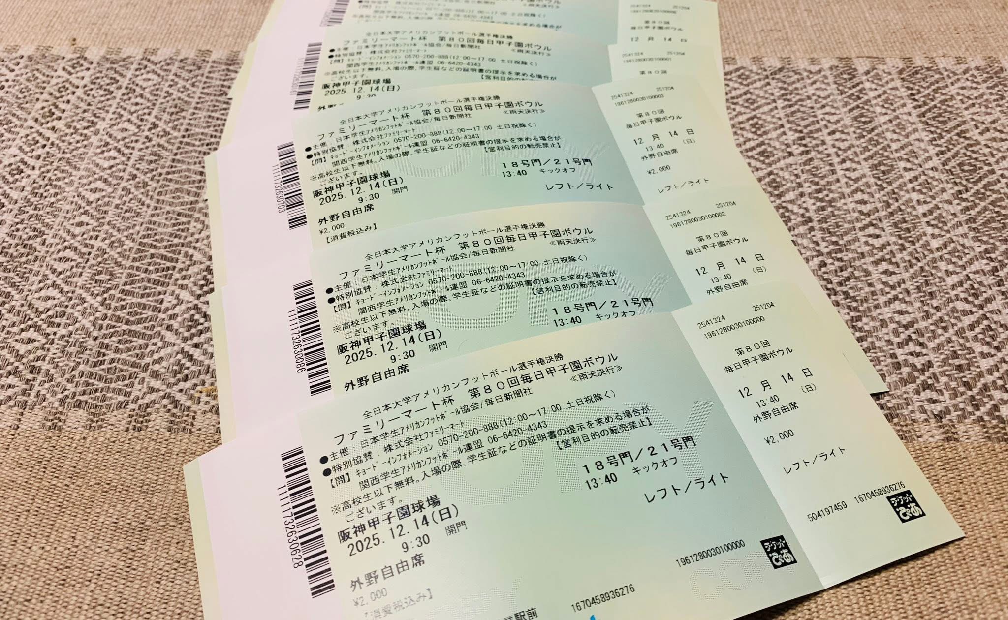 ▪️12月14日、いよいよ甲子園ボウルです。13:40キックオフです。すでにチケットを5枚購入しました。職場内にある関学の同窓会である龍谷大学新月会の会員のうち、アメリカンフットボールが好きなメンバー4名(プラス奥様とお子さん、あわせて6人)で応援します。当日は、ライト側の外野から応援します。ライト側だと、試合の展開を横からではなくて、ゴールポーストの片方から応援することになります。これはこれで、面白そうです。たとえば、オフェンスラインが相手にディフェンスを押しまくり、そこにできた隙間をRBが突っ走るシーンが見られるかもしれません。また、今年は関西学院ファイターズは1塁側らしく、ファイターズは関学の学生・教職員500名をライト自由席に無料招待するらしく、母校の関係者と一体となって応援できるのではないかと思います。