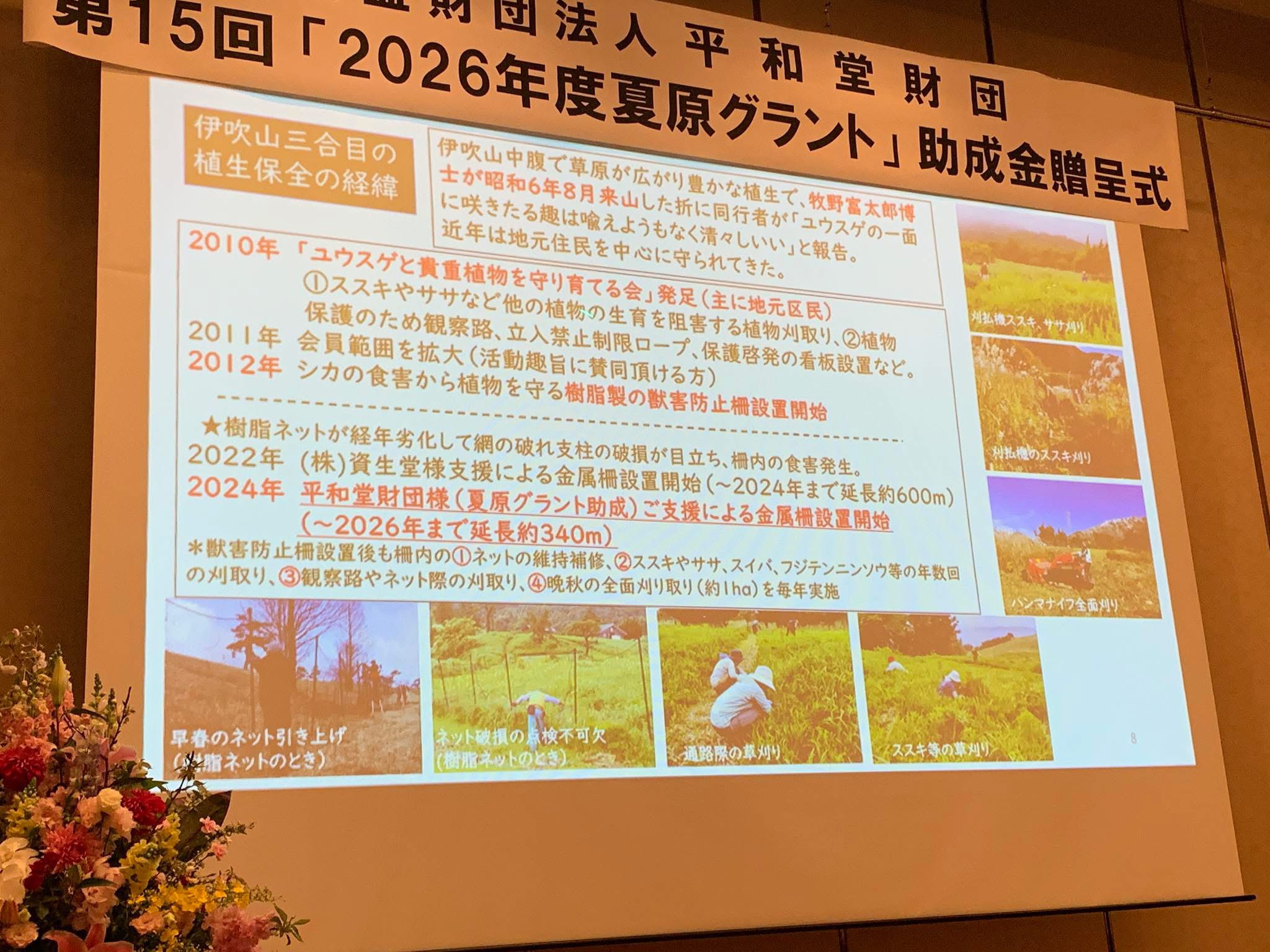 ▪️今日は、私の講評の後に、優れた活動をされている3つの団体から活動報告がありました。最後に報告されたのは、米原市の「ユウスゲと貴重植物を守り育てる会」からの報告でした。報告者は、高橋滝治郎さんです。滋賀県が世界農業遺産を目指して申請準備をしていた時、私はお手伝いをさせていただきましたが、高橋さんはその時の農政水産部長さんでした。今は、退職されて、地元のお仲間と、鹿の食害によって荒れ果ててしまった伊吹山を回復していく取り組みをされています。「伊吹山三合目 豊な植生を守る獣害防止金属柵設置事業」です。頑丈な金属柵で、三合目の貴重な植生を囲って保護する事業です。助成したお金を全て金属柵の購入に当てられました。目的が大変明確です。素晴らしい。現在、観察会を毎月開催されているようですが、私は、7月の夕方に咲くユウスゲを鑑賞しに行ってみたいと思っています。