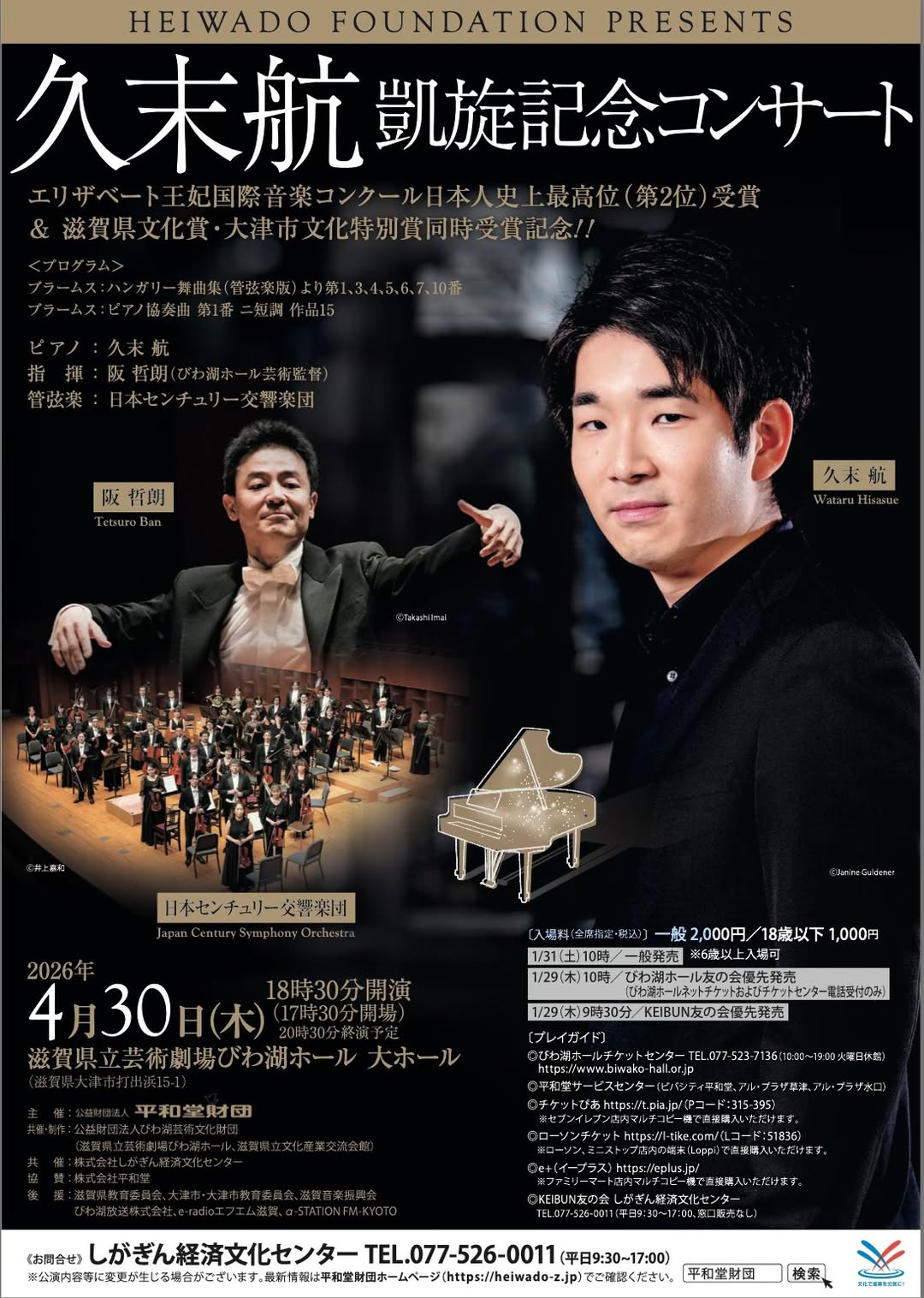 ▪️世界的ということでいえば、昨年のことになりますが、平和堂財団の芸術奨励賞を2013年に受賞し、2015~2017年の海外留学助成を受けられた久末航さんが、「世界三大コンクール」のひとつと言われている「エリザベート王妃国際音楽コンクール」のピアノ部門で2位に入賞されました。久末さんは、大津市出身です。4月30日には、久末さんの「凱旋記念コンサート」がびわ湖ホールで開催されます。楽しみにしています。