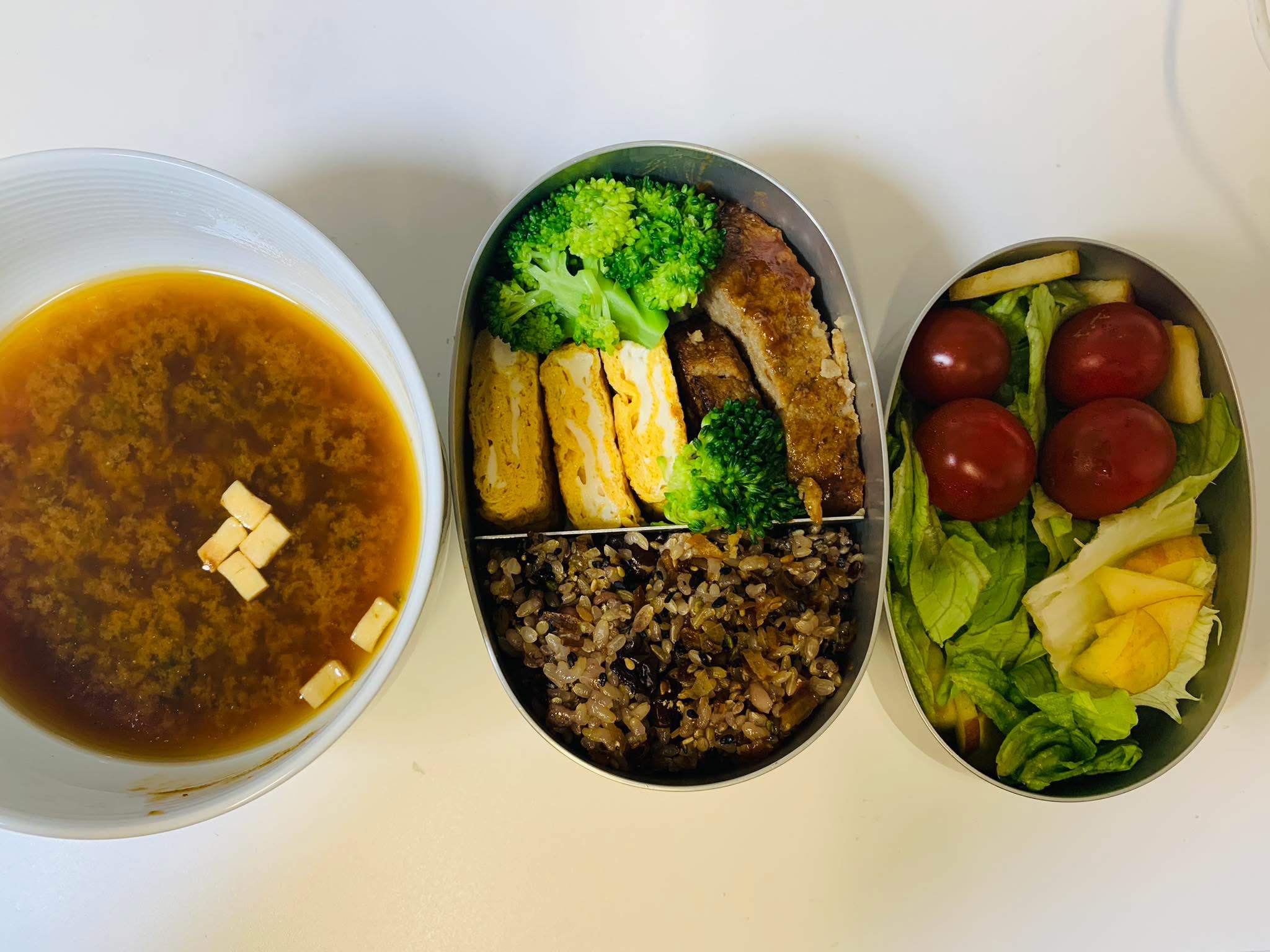 ▪️個人的には、今日から新年度の仕事が始まりました。朝、弁当を作りました。小さな弁当箱にご飯とおかずを詰めただけですが。卵焼きは、昨晩作っておいたもの。ハンバーグは既製品のレトルト食品。付け合わせは冷蔵庫に常備している湯がいたブロッコリー。ブロッコリー安くなってきましたね。レタスとリンゴのサラダも冷蔵庫に常備してあります。そこに、プチトマト。ご飯は、もちろん白米でなく、玄米に十六石米を加えて炊いたものに、黒胡麻を加えたものです。GI値はかなり低いのではないかと思います。あと、インスタントの味噌汁。